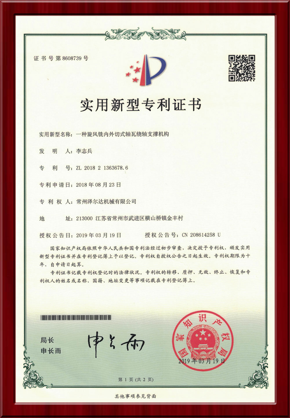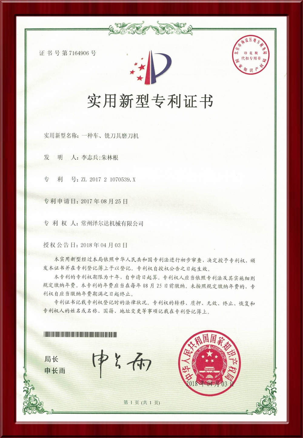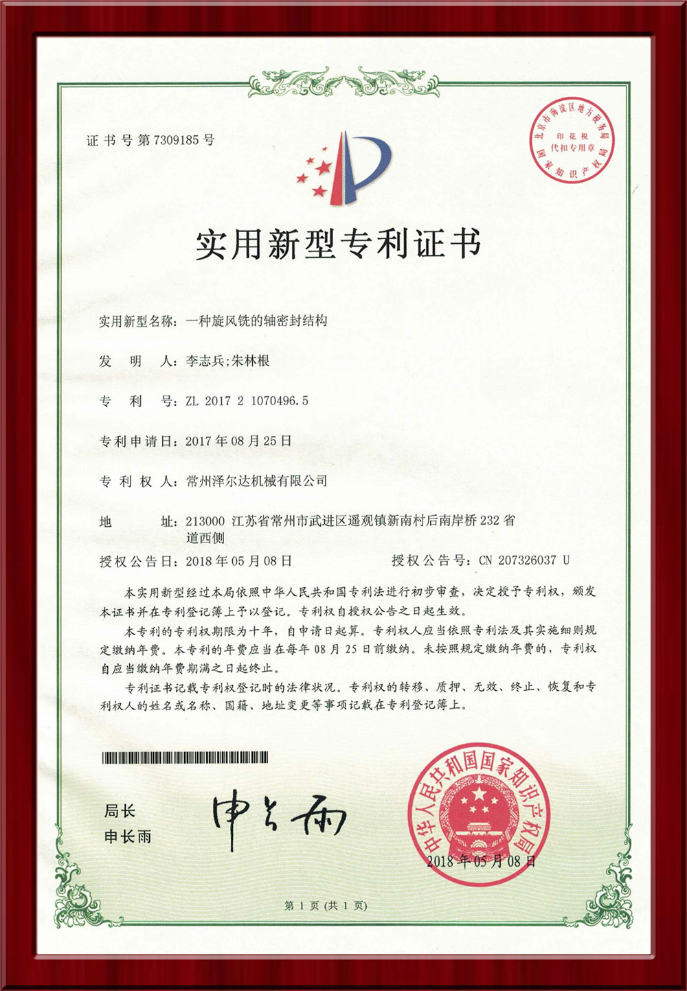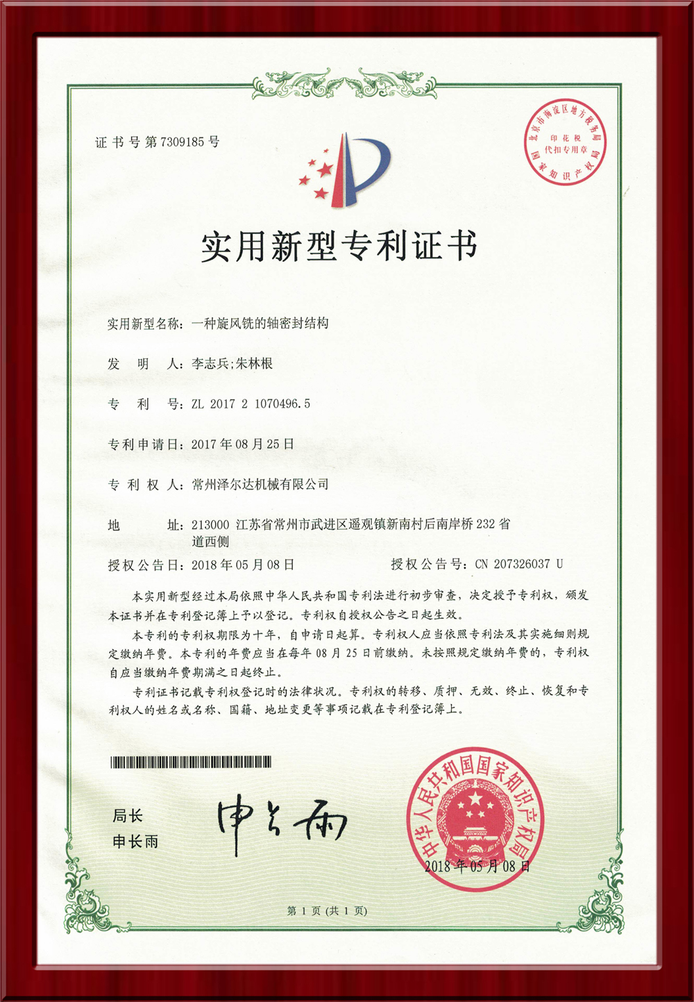 • 7309185實(shí)用新型專利