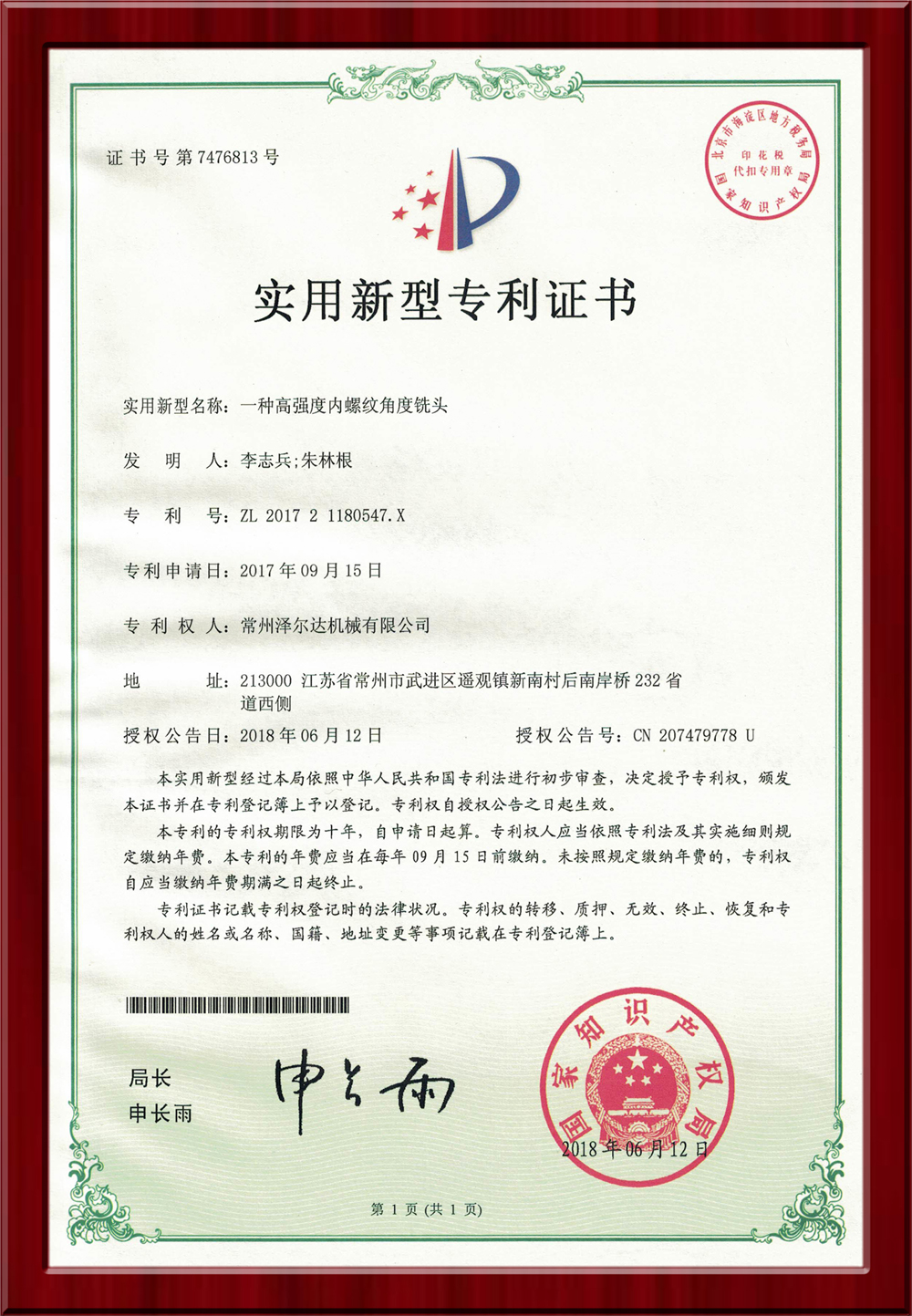 • 7476812實(shí)用新型專利